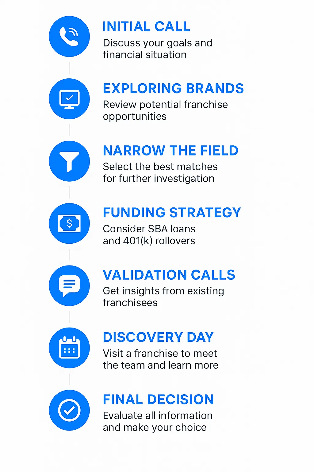 We know looking into franchises can feel overwhelming, but it doesn’t have to be. At Free Franchise Broker, we guide you through the process step by step with real support, honest advice, and no pressure. Here’s what it looks like:
